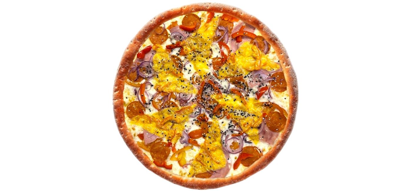 соус сливочный, сыр моцарелла, бекон, пеперони, перец болгарский, лук красный, сыр чеддер, кунжут