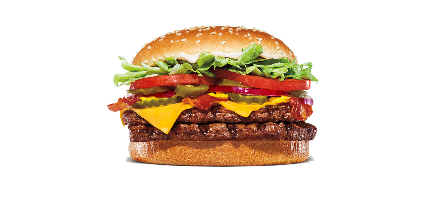 Бургер с пшеничной булочкой с кунжутом, двойной порцией сочной котлеты из говядины, соусом бургер, хрустящим жареным беконом и фри луком, сливочным сыром Чеддер, листьями салата, свежими томатами и маринованными огурчикам, красным сладким луком